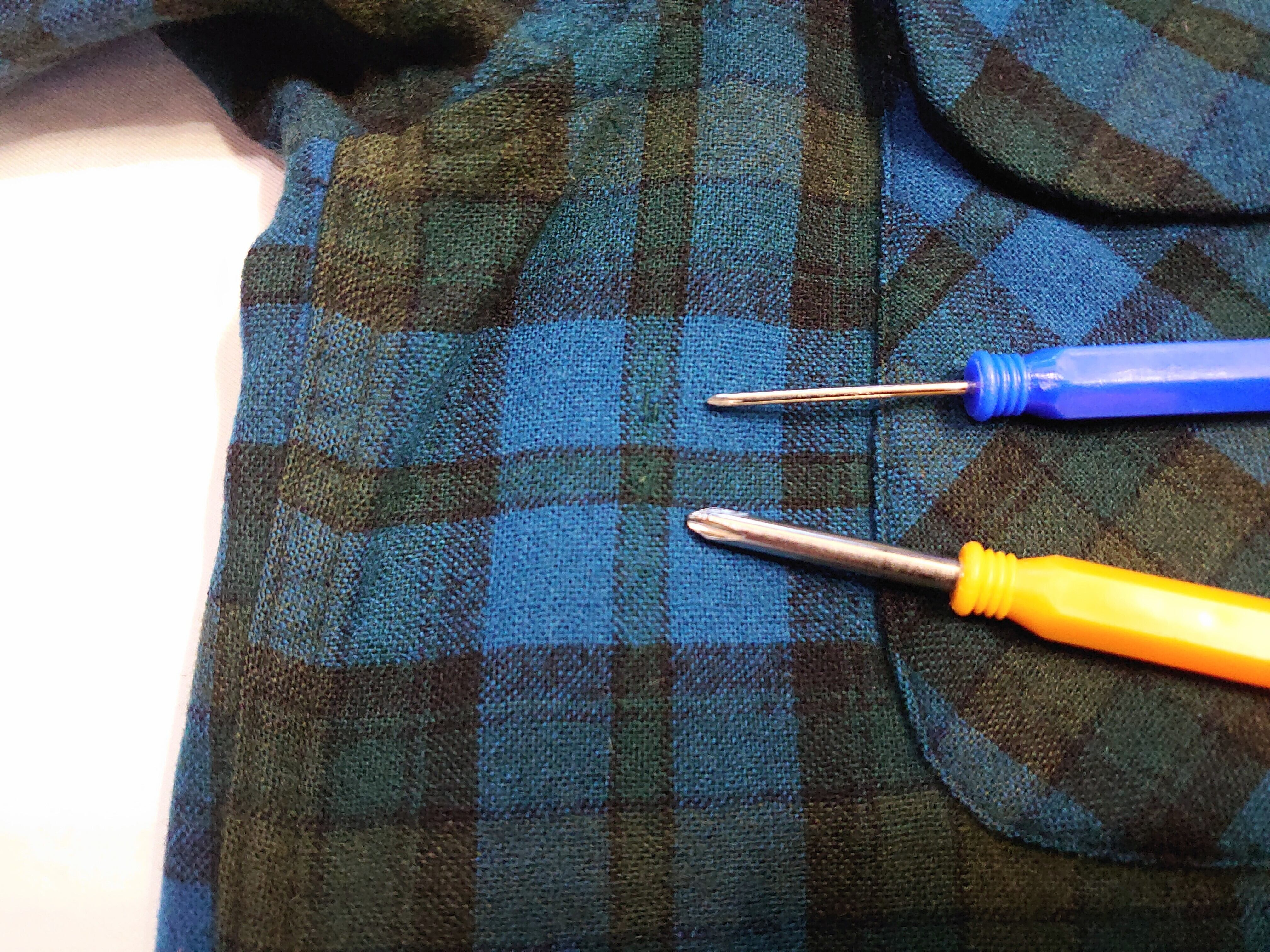 襟折れ目にうっすら程度の薄汚れ、右ポケット横に小さい手縫いリペアがありますが、目立たないと思います。